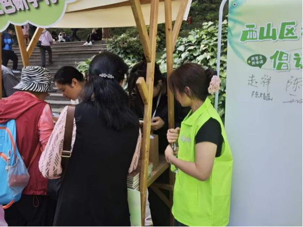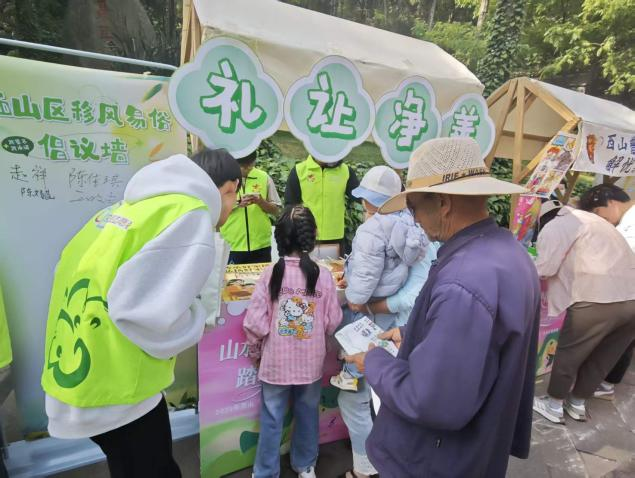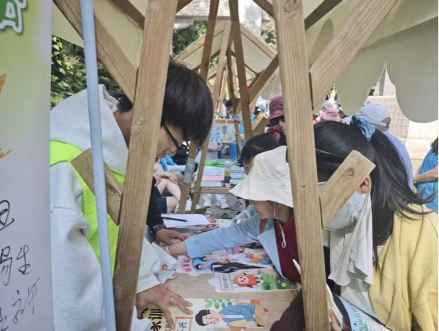 在文明互动环节,志愿者引导游客参与文明主题拼图小游戏,依托拼图图案,生动科普文明游园、绿色低碳出行、家风家训传承、移风易俗新风尚等知识,在趣味玩乐中向大众传递新时代文明理念。游客完成互动拼图后,志愿者为其送上专属纪念小礼品,并诚挚邀请大家在文明倡议墙上签名留诺,以签名承诺强化群众文明践行意识。全程志愿者坚守岗位,维护摊位现场秩序,耐心解答游客各类咨询,主动守护游园环境整洁,保障整场互动宣传活动有序顺畅开展。